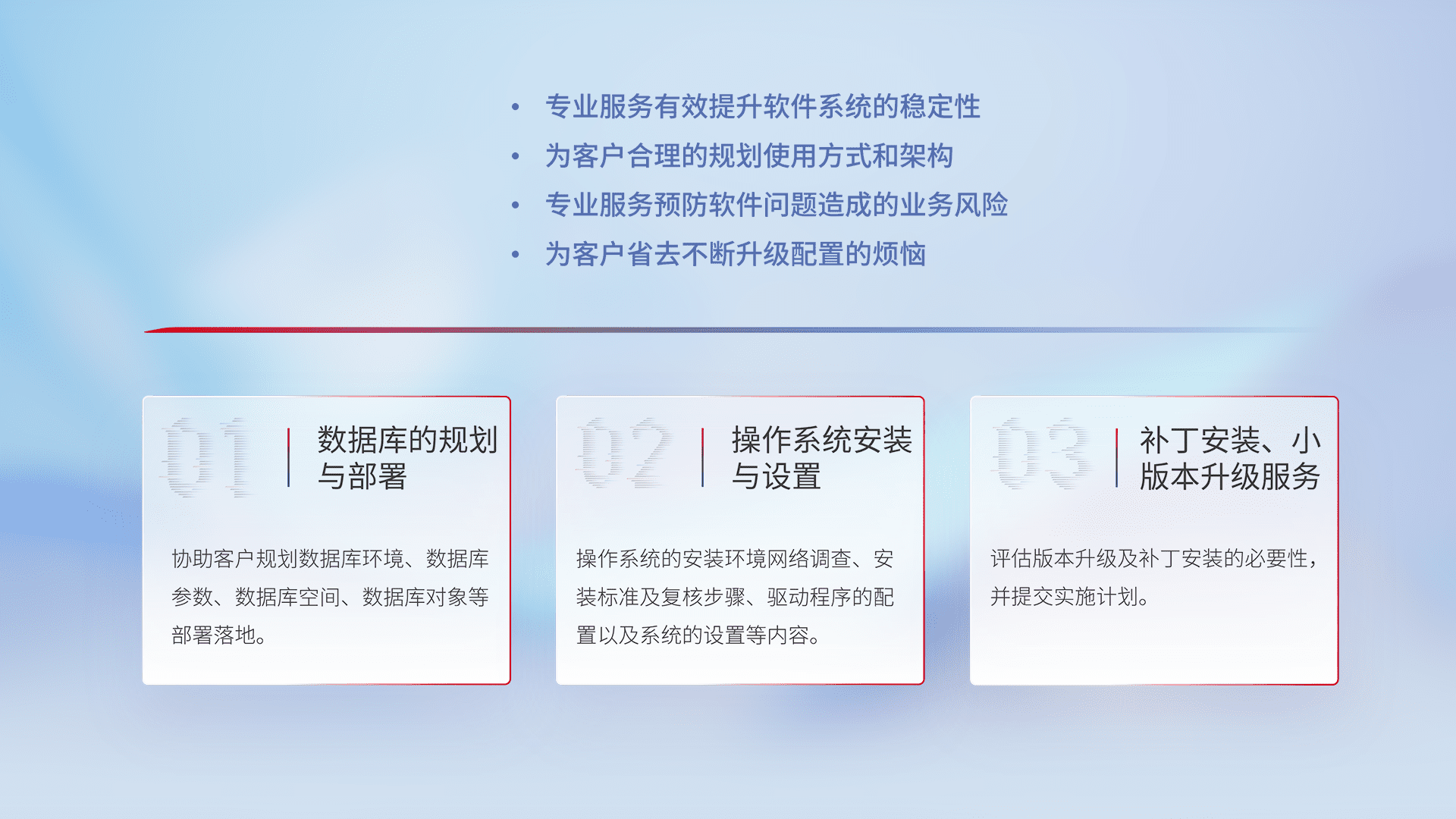 为客户提供软件规模升级、、、、快速部署、、按需配置的专业服务,,,从数据库的规划与部署到操作系统的安装与设置,,再到补丁安装和小版本升级提供支持。。。。